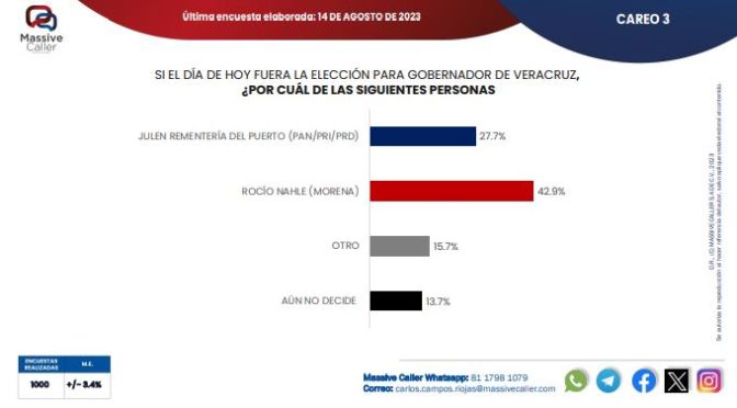 De acuerdo a Massive Caller, en el análisis por candidatos, si hoy fueran las elecciones, en un primer escenario hipotético en que se enfrentaran Rocío Nahle y Miguel Ángel Yunes Márquez, la morenista se impondría fácilmente con 42.5 por ciento de la intención del voto contra 28.4 por ciento.