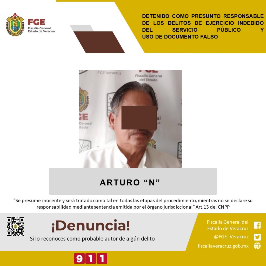 Xalapa, Ver., 18 de agosto del 2023.- La Fiscalía General del Estado informa, que elementos de la Policía Ministerial, adscritos a la Fiscalía Especializada en Combate a la Corrupción, cumplimentaron orden de aprehensión en contra de Arturo “N”, como presunto responsable de los delitos de ejercicio indebido del servicio público y uso de documento falso, cometidos en el año 2019, cuando fungía como presidente municipal de Ángel R. Cabada.