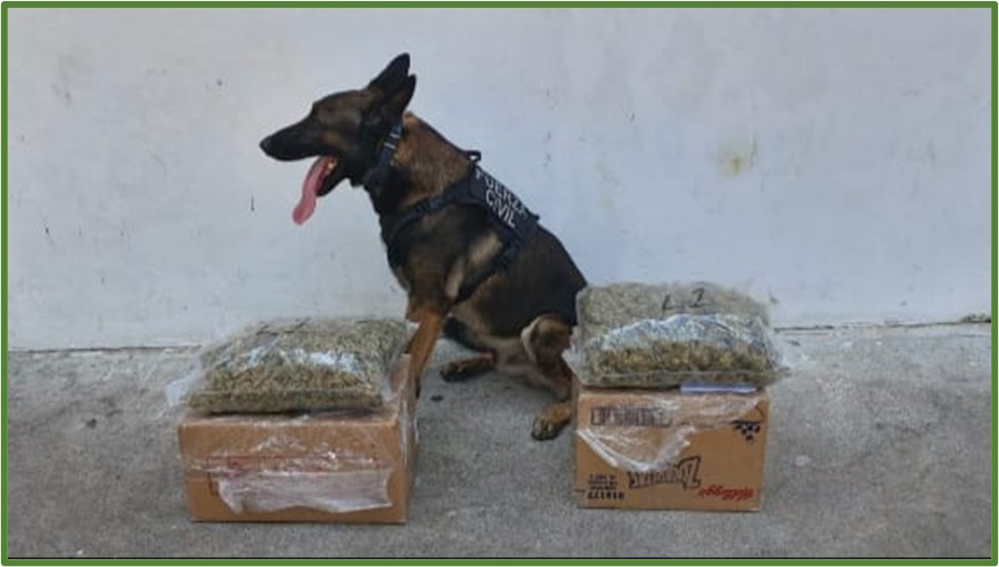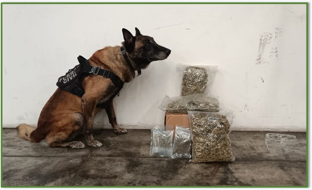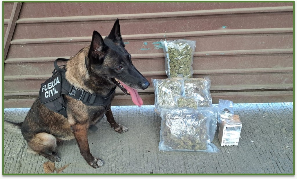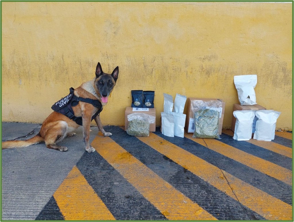 Xalapa, Ver., 23 de agosto de 2023.- Durante el mes de agosto efectivos de la Secretaría de Seguridad Pública (SSP), a través de la Compañía K9 de Fuerza Civil han realizado distintos operativos en negocios dedicados al envío de paquetería, asegurando hasta el momento 18 kilos 361 gramos de hierba verde con características similares a la marihuana, además de otros estupefacientes.