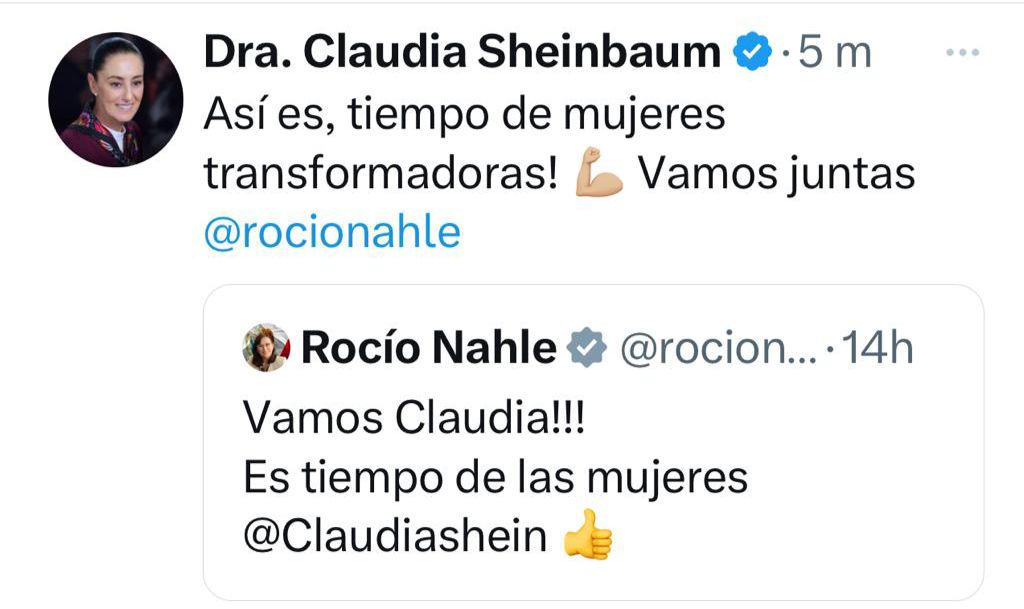 “¡Vamos Claudia, es tiempo de las mujeres!”, posteó la Secretaria de Energía, Rocío Nahle García a lo que Sheimbaum Pardo citó de inmediato y respondió “Así es, tiempo de mujeres transformadoras! 💪🏼Vamos juntas Rocío Nahle”