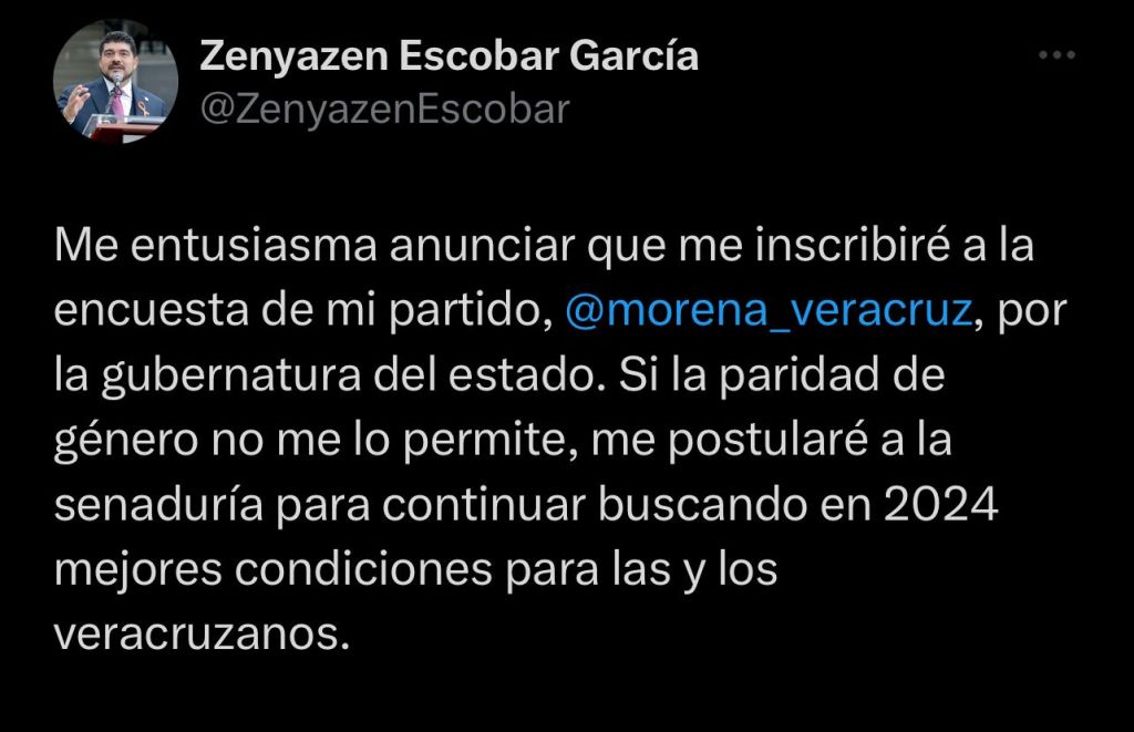 Luego de que en redes sociales anunciara su deseo por continuar sirviendo a las y los veracruzanos, Escobar García puntualizó que solicitará su ingreso en la encuesta que realizará el partido Movimiento de Regeneración Nacional (MORENA) como una medida que le permita conocer la aceptación que tiene entre la población.