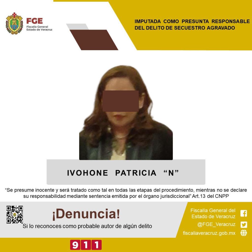 XALAPA, Ver; 24 de septiembre del 2023.-La Fiscalía General del Estado realizó imputación en contra de Ivohone Patricia “N” como presunta responsable del delito de secuestro agravado, hechos suscitados en Poza Rica el pasado 3 de abril del presente año, en agravio de una víctima de identidad resguardada.