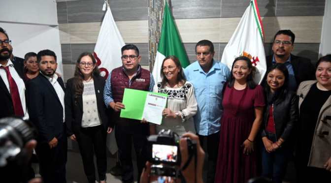 Acompañada de militantes, alcaldes y diputados, entregó su constancia al dirigente estatal Esteban Ramírez Zepeta, aunque no lo marcaba la convocatoria, explicó que ella desde hace muchos años, en cada aspiración presenta de manera formal con un documento sus intenciones.