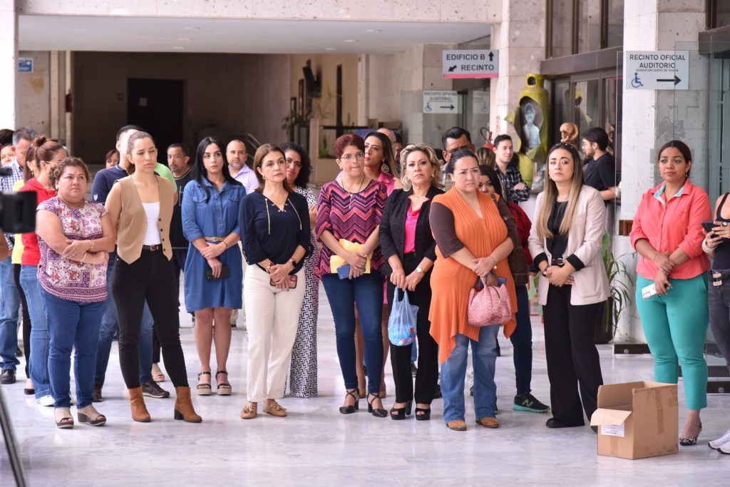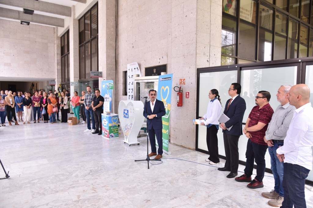 Posteriormente, el legislador Juan Javier Gómez Cazarín y el secretario del Sindicato Único de Trabajadores al Servicio del Poder Legislativo (SUTSPL), José de Jesús Rodríguez Hernández, colocaron en el contenedor las tapas de plástico que llevaban, seguido de las y los empleados que hicieron lo propio.