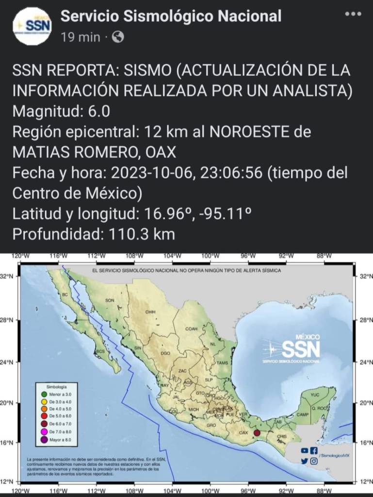 El sismo, que el Servicio Sismológico Nacional actualizó a magnitud 6.0 con una profundidad de 110 km y una ubicación a 12 km al noroeste de Matías Romero, Oaxaca, fue percibido en 84 municipios veracruzanos, sin que se reporten incidentes. Las fuerzas de tarea mantendrán el monitoreo, pero con este reporte se da cierre a las actualizaciones.