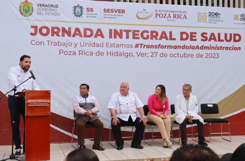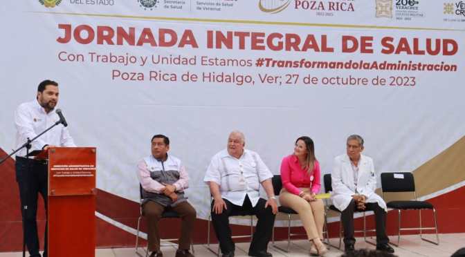 Poza Rica, Ver., 27 octubre de 2023.- Al poner en marcha la Jornada Integral de Salud en la explanada del Ayuntamiento de Poza Rica, el Director Administrativo de Servicios de Salud de Veracruz, Jorge Sisniega Fernández, reiteró el compromiso del Gobierno de la Cuarta Transformación, de fortalecer la atención médica para un mejor cuidado de la salud de la población veracruzana.
