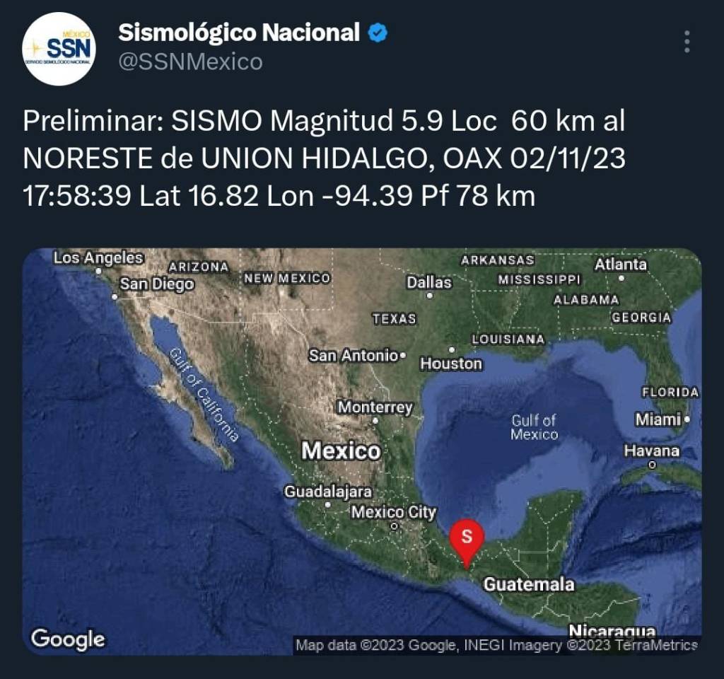 2 de noviembre de 2023, Agua Dulce, Ver.- A las 17:58 hrs se registró un sismo a 60 km al Noroeste de Unión Hidalgo, Oaxaca, de magnitud 5.9 a una profundidad de 78 km, teniendo percepción en 24 municipios del sur de Veracruz, además de Zongolica en el centro del estado, sin que se registren afectaciones.