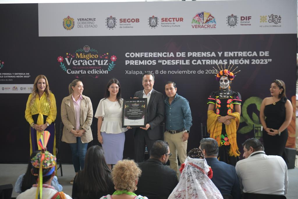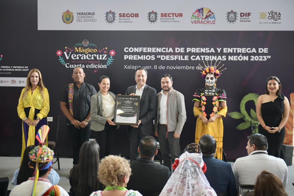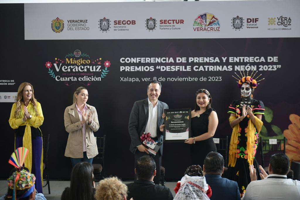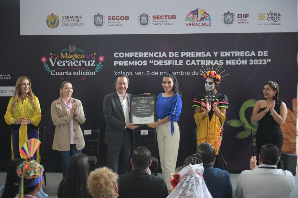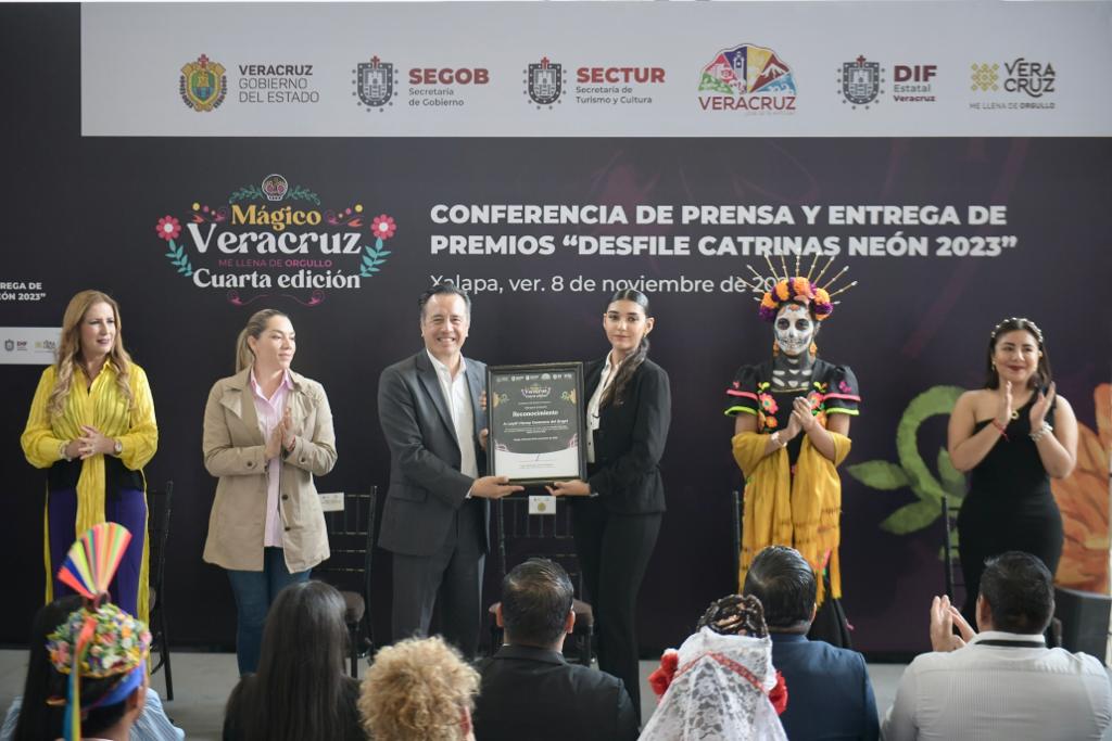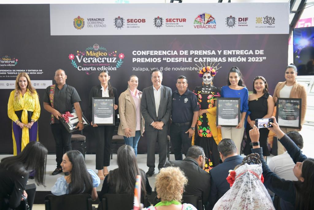 Xalapa, Ver., 08/11/23.- El gobernador Cuitláhuac García Jiménez, acompañado de la directora del Sistema DIF Estatal, Rebeca Quintanar Barceló entregó los premios a los ganadores del Desfile del Día de Muertos Neón 2023, en las categorías de Catrinas, Carro Alegórico y Contingentes, en el que participaron más de 15 mil personas en un recorrido por las principales calles de esta ciudad.