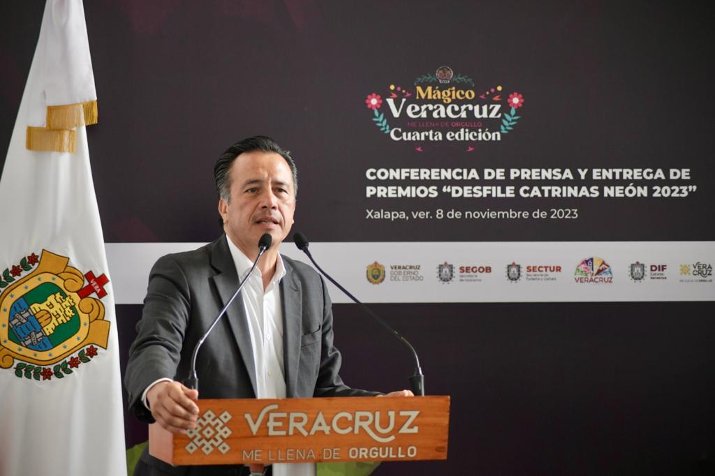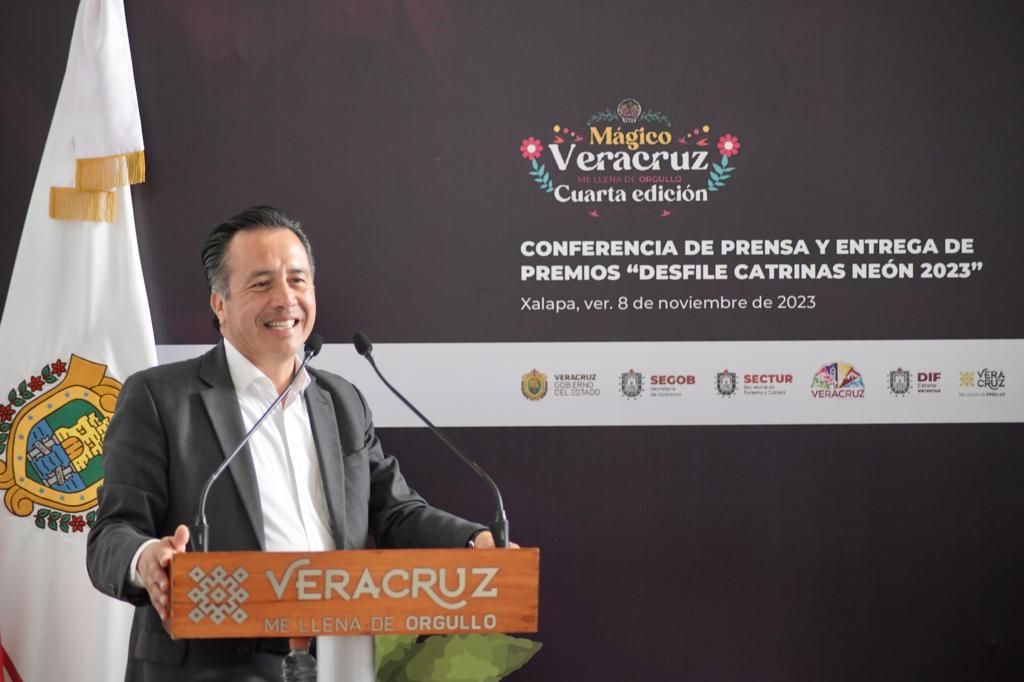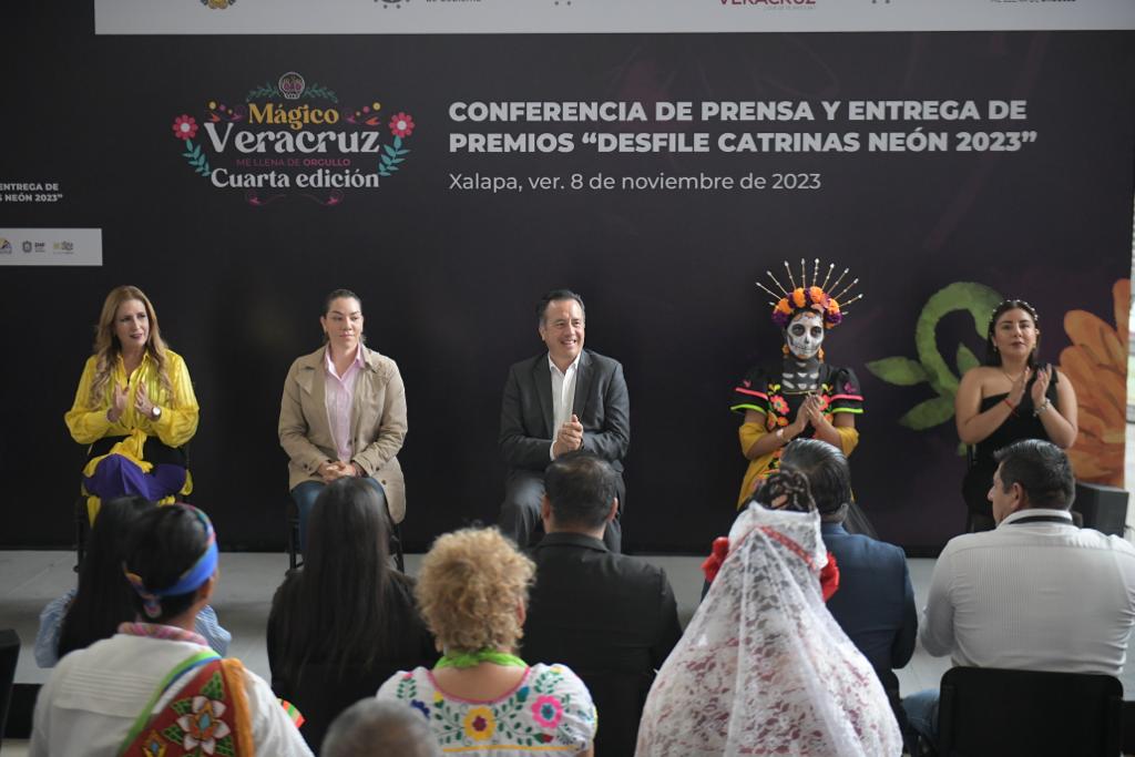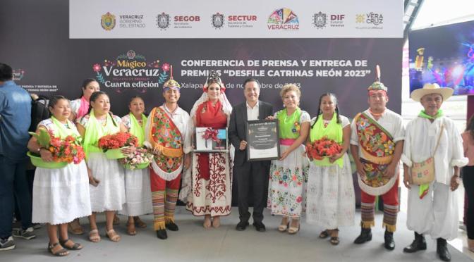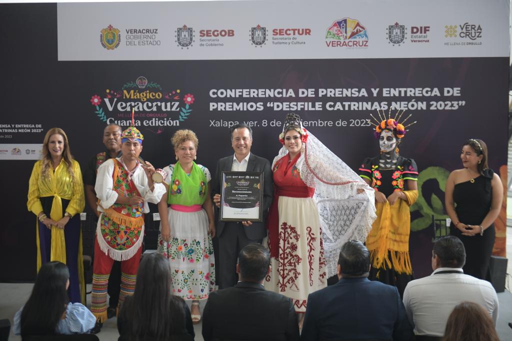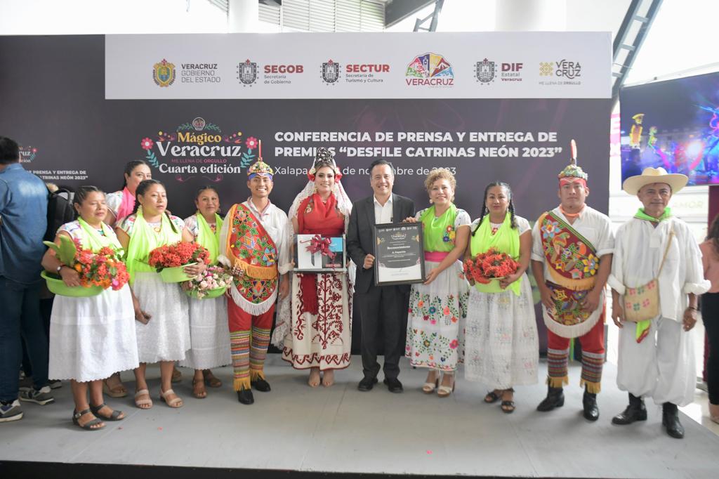 Xalapa, Ver., 08/11/23.- El gobernador Cuitláhuac García Jiménez, acompañado de la directora del Sistema DIF Estatal, Rebeca Quintanar Barceló entregó los premios a los ganadores del Desfile del Día de Muertos Neón 2023, en las categorías de Catrinas, Carro Alegórico y Contingentes, en el que participaron más de 15 mil personas en un recorrido por las principales calles de esta ciudad.