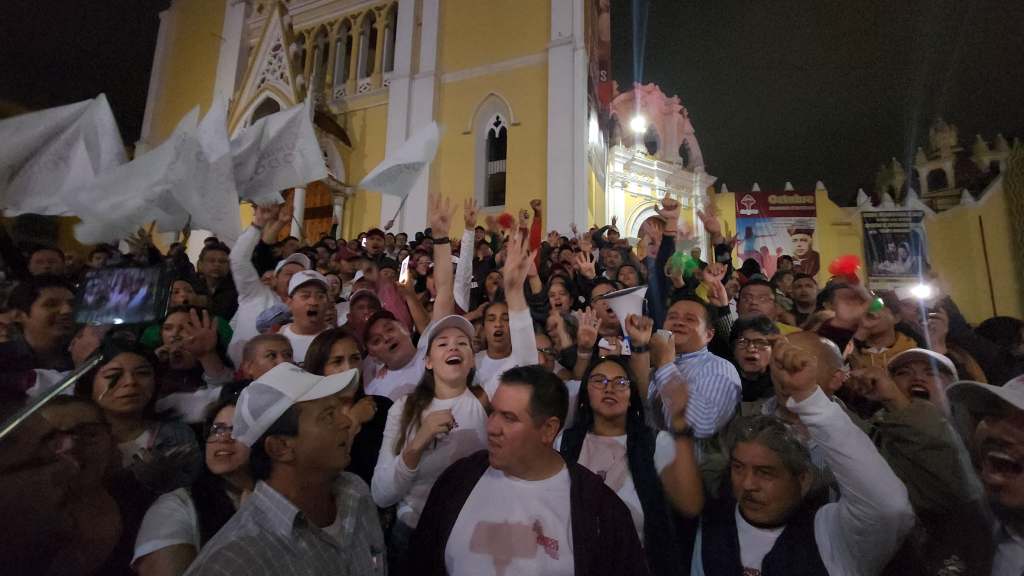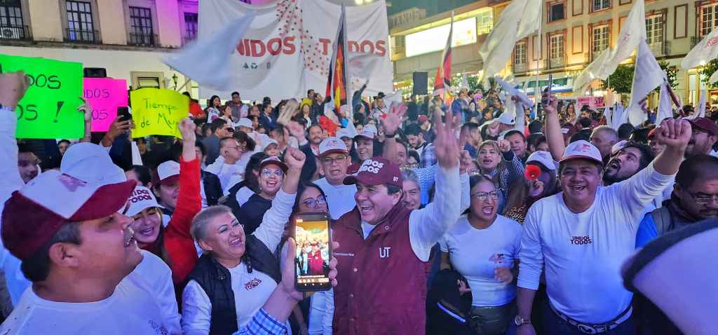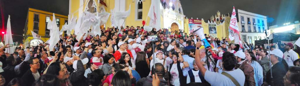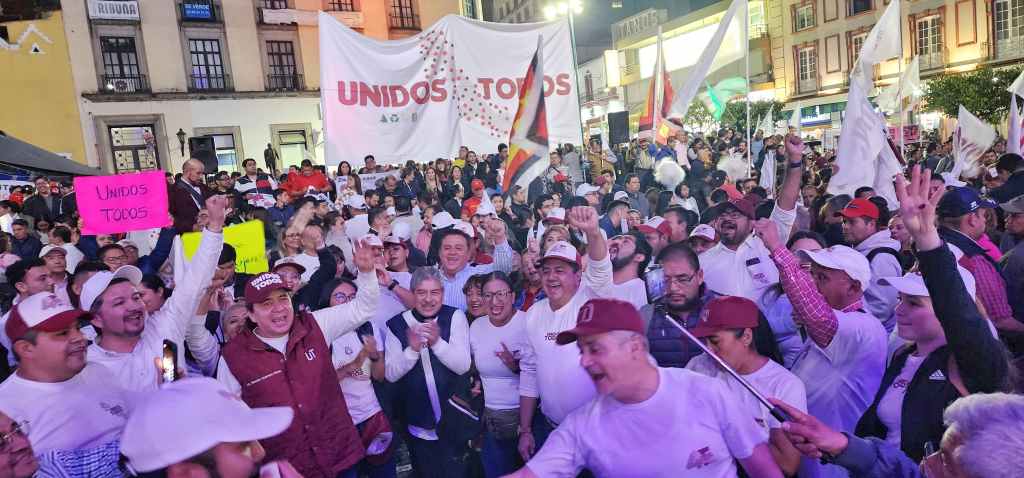 Se ondearon banderas blancas del partido y el movimiento Unidos Todos, convirtiendo la plaza Lerdo en una verbena que simboliza el reflejo de una sociedad que ya decidió seguir el rumbo que dicta la Cuarta Transformación.