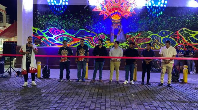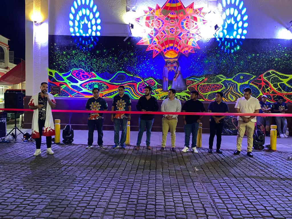 San Andrés Tuxtla.- Con el fin de embellecer la ciudad, alegrar la vista de quien cruce y sobre todo, honrar la cultura globera de San Andrés Tuxtla, el presidente de “Juntos Crecemos”, Yoel Rocha, inauguró el mural «La noche de mil soles».