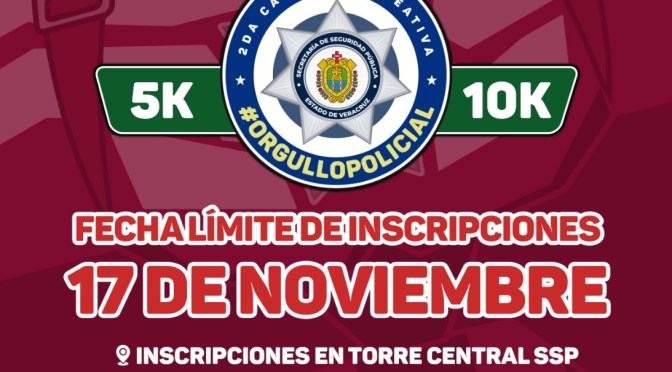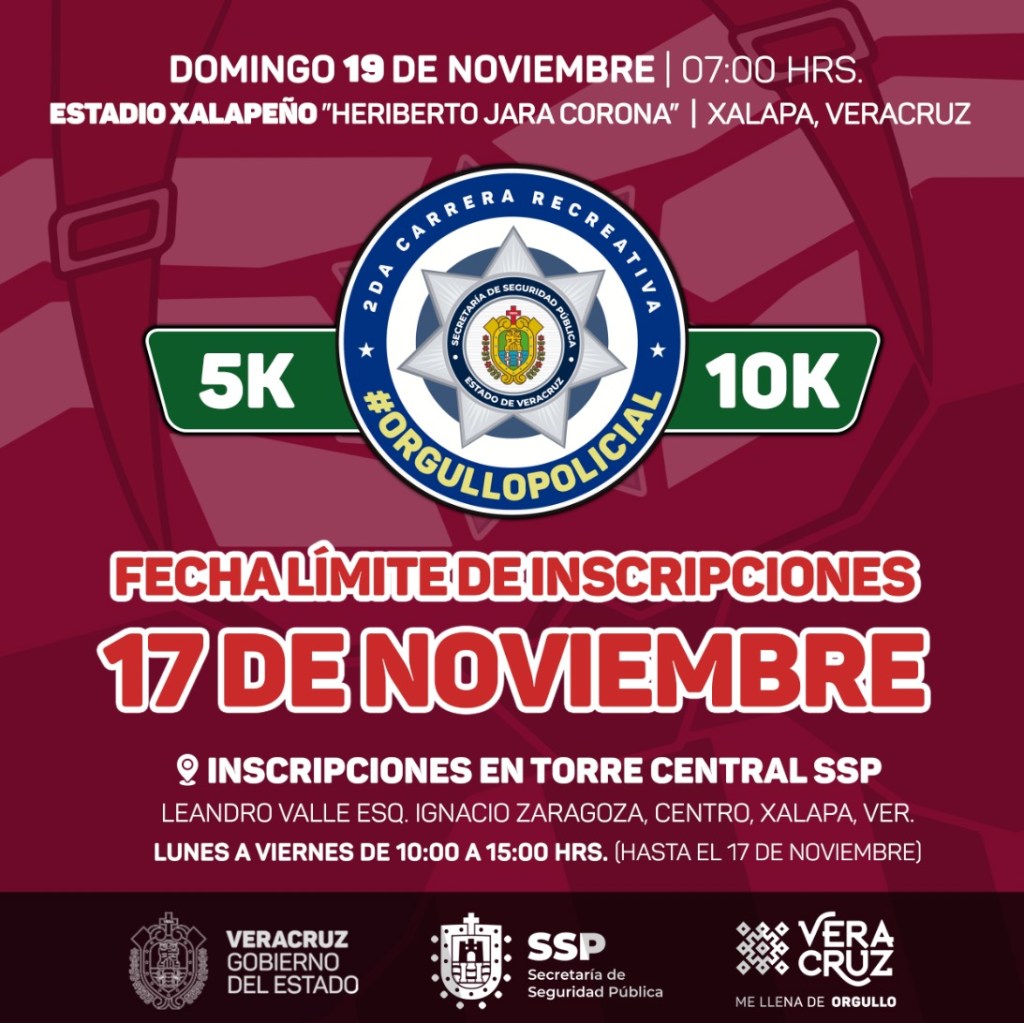 En el Gobierno de la Cuarta Transformación, encabezado por el Ing. Cuitláhuac García Jiménez, buscamos fomentar el deporte, la convivencia familiar y enaltecer los valores que nos hacen sentir orgullosos de pertenecer a la Secretaría de Seguridad Pública, por lo que te seguimos invitando a participar en la 2da Carrera Recreativa Orgullo Policial 2023, el próximo 19 de noviembre.
