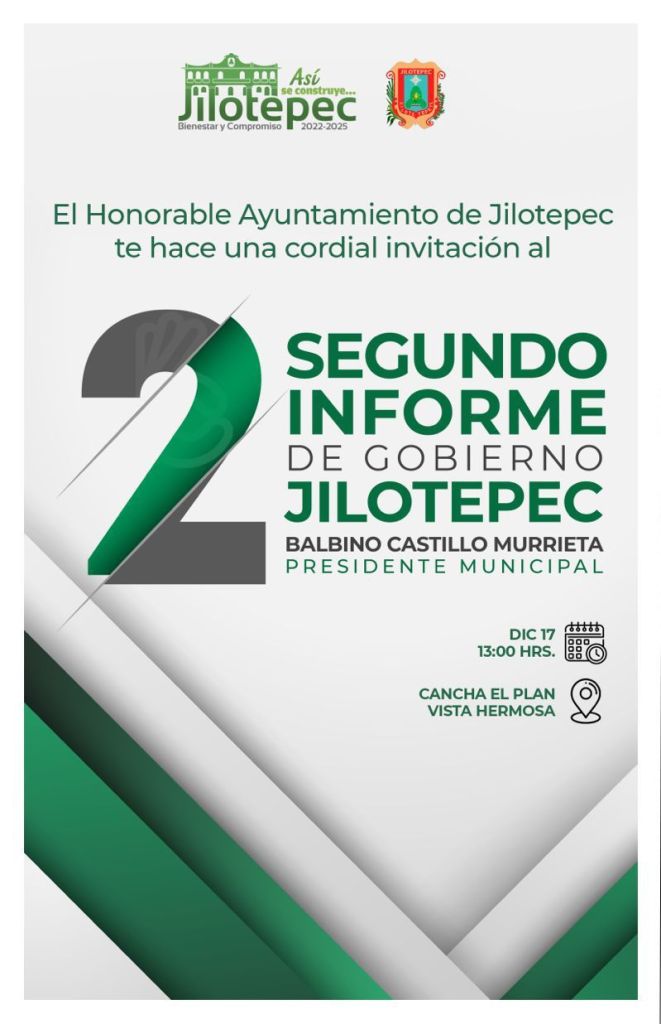 El presidente municipal de Jilotepec, Balbino Castillo Murrieta, hace una cordial invitación a su Segundo Informe de Gobierno a realizarse el 17 de diciembre, a la 1 de la tarde, en la Cancha El Plan en Vista Hermosa, donde dará a conocer los resultados de este segundo año de trabajo.