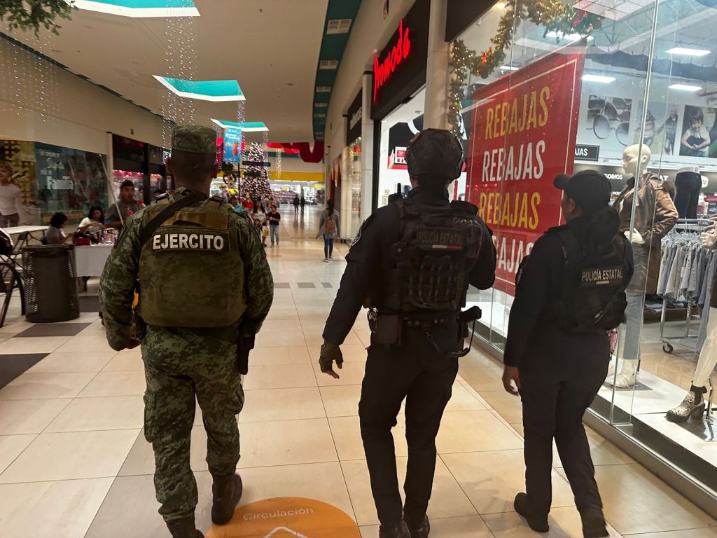 Xalapa, Ver., 28 de diciembre de 2023.- Efectivos de la Secretaría de Seguridad Pública (SSP), a través de Policía Estatal, en coordinación con elementos de la SEDENA y Policía Vial mantienen el esquema preventivo mediante recorridos al interior y exterior de plazas comerciales, además de implementar filtros de inspección aleatorios en Coatzacoalcos.