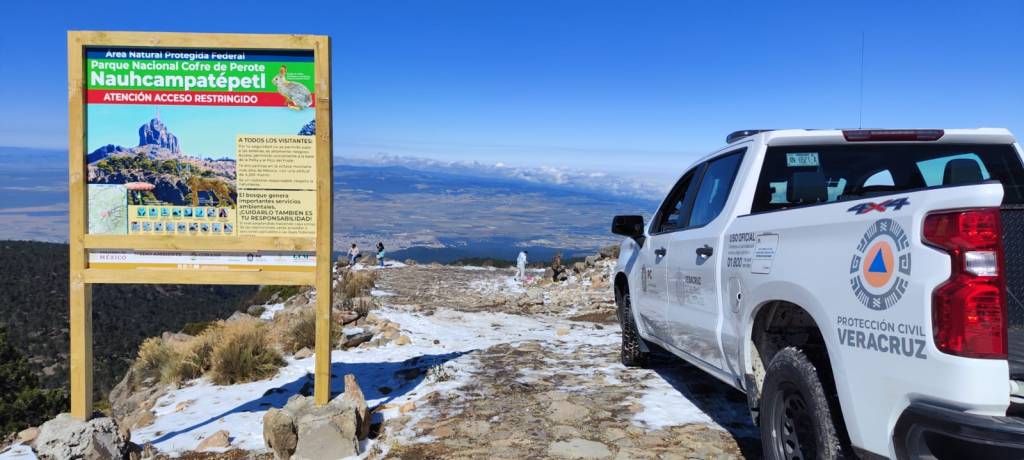 31 de diciembre de 2023, Xalapa de Enríquez, Ver.- Ante la recientes nevada registrada en la cumbre del Parque Nacional Cofre de Perote, la Secretaría de Protección Civil coordinó con fuerzas de tarea de los tres órdenes un operativo para la salvaguarda de quienes visitaron la zona.