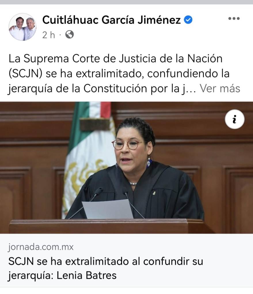 Asimismo, retomó el discurso de la nueva magistrada en la imposición de toga, donde aseveró que la Suprema Corte de Justicia de la Nación (SCJN) se ha extralimitado, confundiendo la jerarquía de la Constitución por la jerarquía de la instancia.