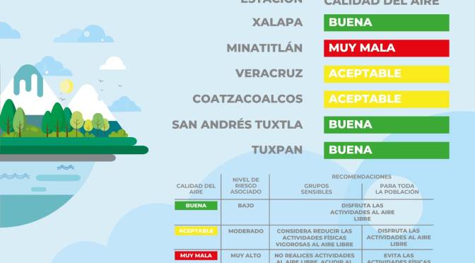 De acuerdo al reporte, Xalapa, San Andrés Tuxtla y Tuxpan reportan índice y calidad del aire buena, con la se pueden realizar actividade al aire libre.