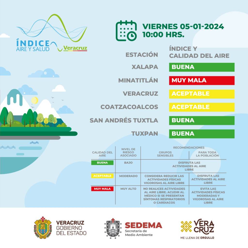 Xalapa, Ver.- Minatitlán registró este viernes una muy mala calidad del aire, de acuerdo al monitoreo ambiental que lleva a cabo la Secretaría de Medio Ambiente del Estado (SEDEMA).