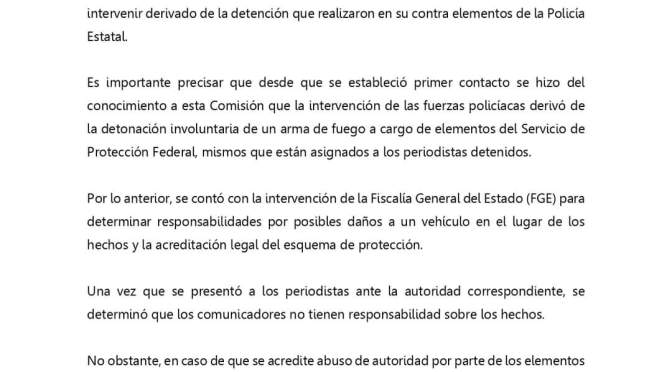 Es importante precisar que desde que se estableció primer contacto, se hizo del conocimiento a esta Comisión que la intervención de las fuerzas policíacas derivó de la detonación involuntaria de un arma de fuego a cargo de elementos del Servicio de Protección Federal, mismos que están asignados a los periodistas detenidos.