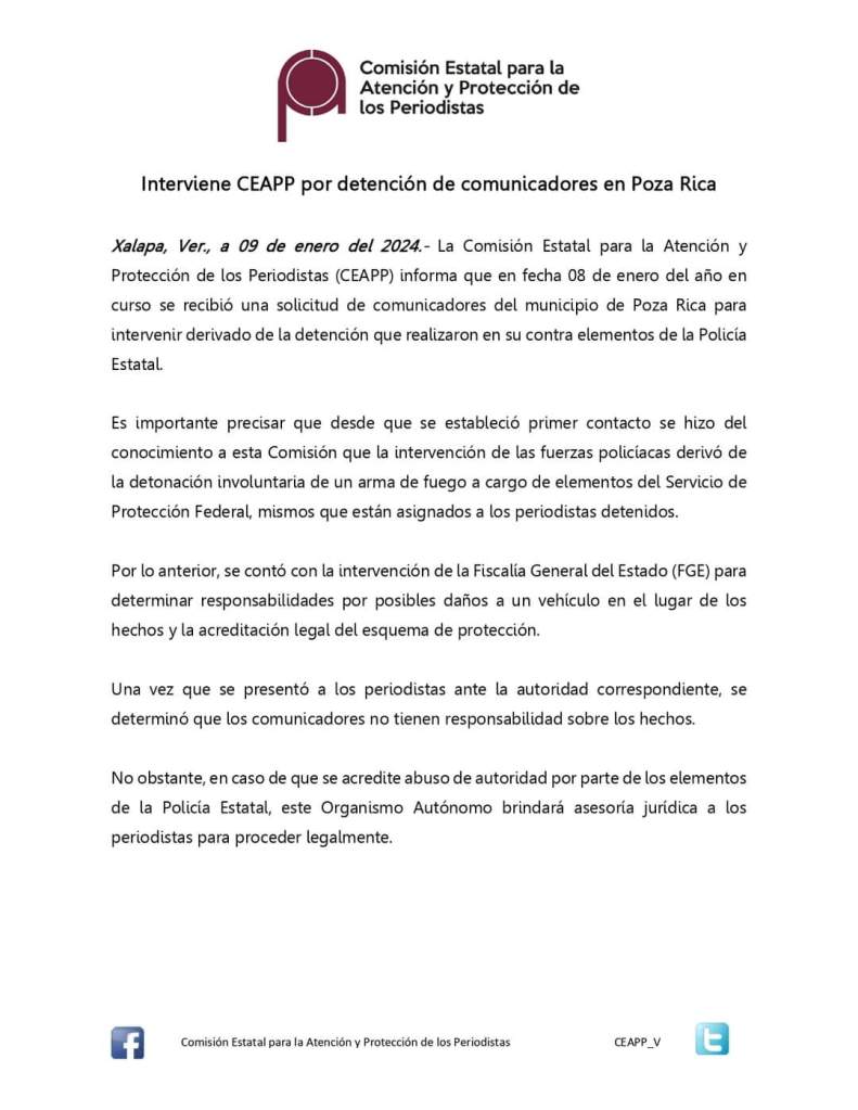 Xalapa, Ver., a 09 de enero del 2024.- La Comisión Estatal para la Atención y Protección de los Periodistas (CEAPP) informa que en fecha 08 de enero del año en curso se recibió una solicitud de comunicadores del municipio de Poza Rica para intervenir derivado de la detención que realizaron en su contra elementos de la Policía Estatal.