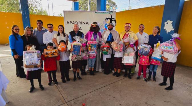 Úrsulo Galván, Ver.– En el marco del Día de Reyes, gracias al convenio de colaboración institucional entre la Universidad Veracruzana (UV) y el H. Ayuntamiento, así como las gestiones del sistema DIF municipal, este jueves 11 de enero, se llevó a cabo la entrega de 80 regalos como parte del programa “Apadrina una Carta”, en la comunidad de Barra de Chachalacas y en el Centro de Atención Múltiple (CAM) número 67 de Cempoala, evento que contó con la distinguida presencia del Vicerrector de la UV Región Veracruz, Dr. Rubén Edel Navarro, el alcalde, Lic. Eder Jero Hernández Lara y la presidenta del Sistema DIF municipal, Lic. Vianney Hernández Vizuet.
