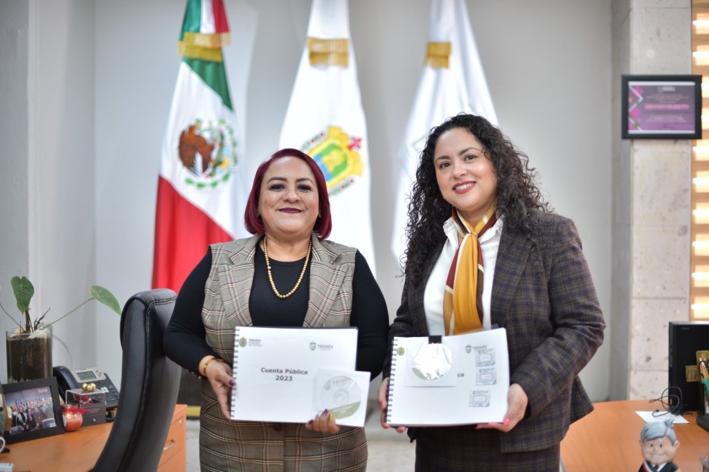 La presidenta de la Mesa Directiva de la LXVI Legislatura, diputada Adriana Esther Martínez Sánchez, recibió de la presidenta del Tribunal de Justicia Administrativa del Estado de Veracruz (Trijaev), magistrada Leticia Aguilar Jiménez, el documento de la Cuenta Pública ejercicio 2023 y el cuarto informe trimestral del organismo autónomo.