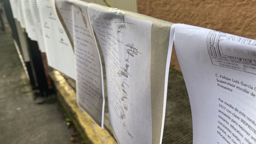 Con un tendedero donde colocaron los oficios que han dirigido a las autoridades correspondientes, denunciando la serie de acciones que ha realizado la titular de la escuela.