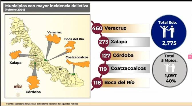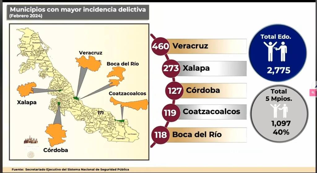 En la conferencia de prensa que ofreció el presidente de la República en Coatzacoalcos, al sur del estado, el secretario dijo que los municipios con más casos de homicidios dolosos son Veracruz Puerto con 460, Xalapa con 272, Córdoba con 127, Coatzacoalcos con 119 y Boca del Río con 118.
