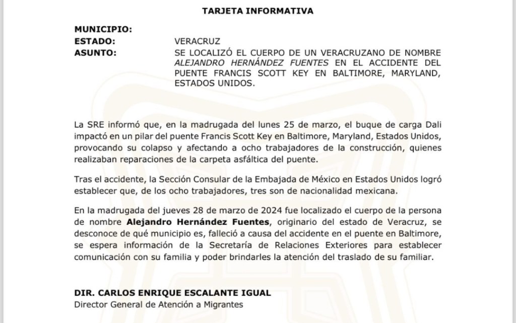 Xalapa, Ver.- El director general de Atención a Migrantes, Carlos Enrique Escalante Igual confirmó que el veracruzano Alejandro Hernández Fuente perdió la vida en el accidente ocurrido en Baltimore, Estados Unidos, el pasado 25 de marzo.