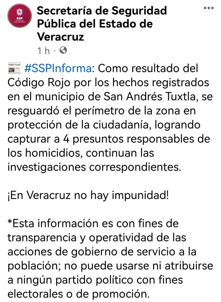 “Logrando capturar a 4 presuntos responsables de los homicidios, continúan las investigaciones correspondientes. ¡En Veracruz no hay impunidad!”.