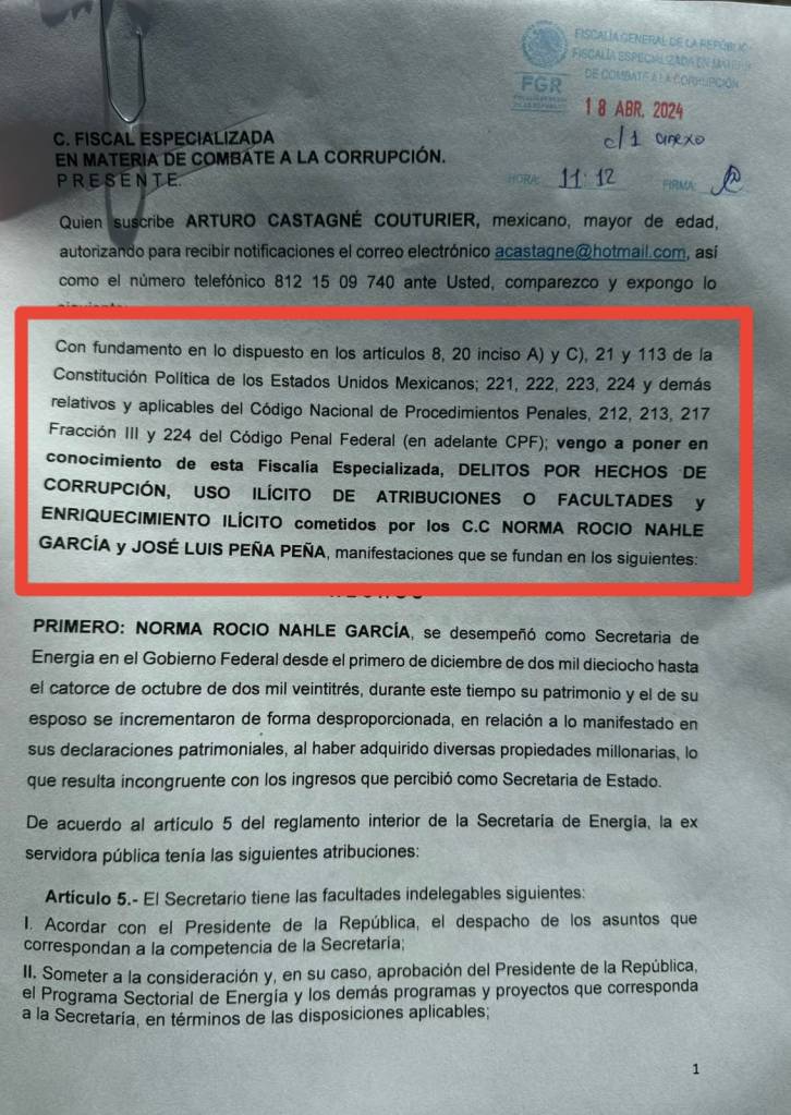 Xalapa, Ver.- El empresario veracruzano Arturo Castagné Couturier presentó ante la Fiscalía General de la República (FGR) una denuncia penal por hechos de corrupción, enriquecimiento ilícito y uso ilícito de atribuciones en contra de la candidata morenista al gobierno del estado de Veracruz, Norma Rocío Nahle García y sus esposos José Luis Peña Peña.