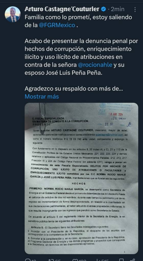 A través de su cuenta de sus redes sociales señaló “Familia como lo prometí, estoy saliendo de la FGR México, acabo de presentar la denuncia penal por hechos de corrupción, enriquecimiento ilícito y uso ilícito de atribuciones contra de la señora Rocío Nahle y su esposo José Luis Peña Peña. Agradezco su respaldo con más de 12,000 firmas. México ya cambió”.
