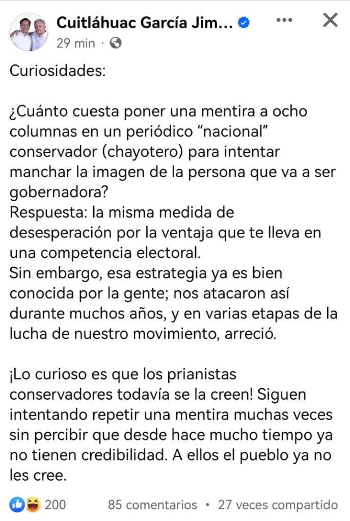 “¡Lo curioso es que los prianistas conservadores todavía se la creen! Siguen intentando repetir una mentira muchas veces sin percibir que desde hace mucho tiempo ya no tienen credibilidad. A ellos el pueblo ya no les cree”.