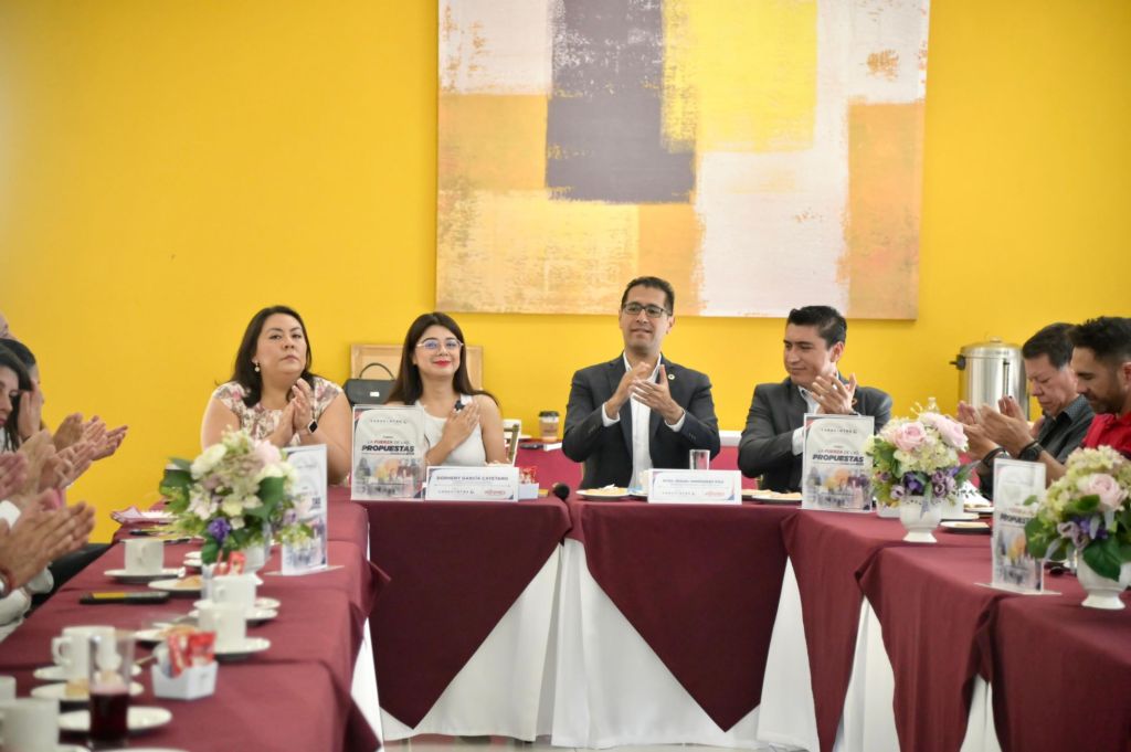 Acompañada del candidato a la Diputación Local su misma alianza «Sigamos Haciendo Historia en Veracruz», pero por el Distrito X, Antonio Ballesteros Grayeb, compartieron mesa con empresarias y empresarios parte de esta organización patronal, que resaltan con estos ejercicios la importancia del diálogo entre sectores para transformar la realidad.