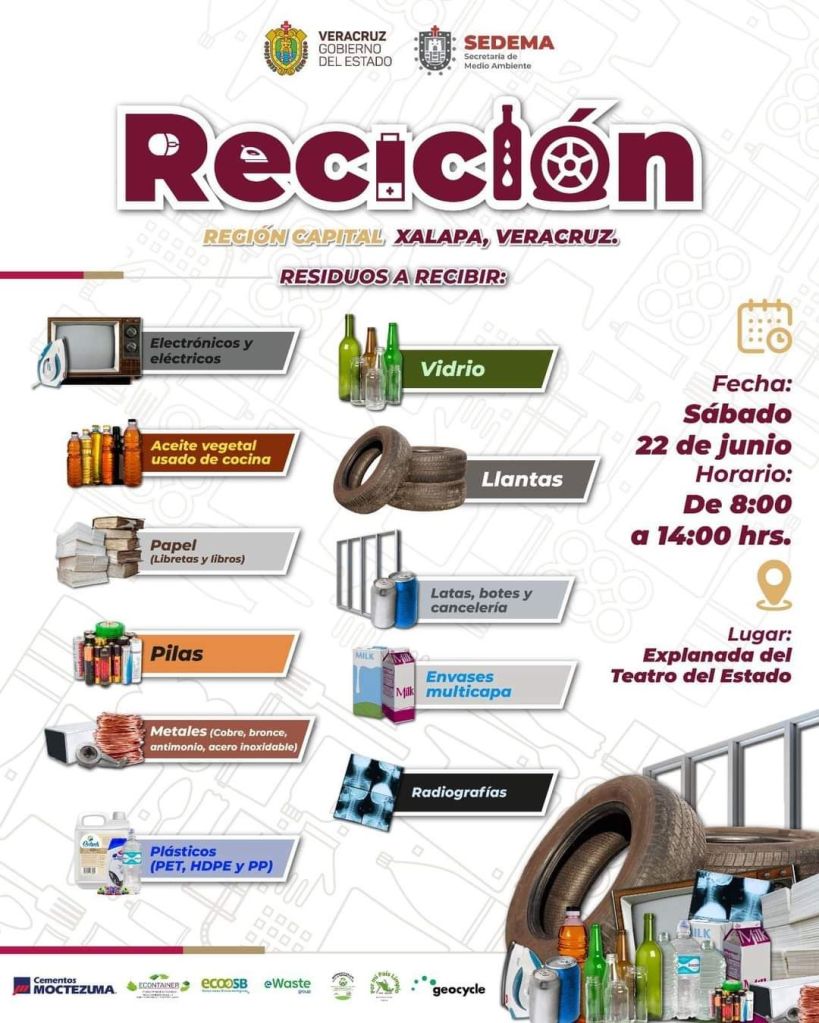 Xalapa, Ver.- Se llevará a cabo el Reciclón Xalapa, en la explanada del Teatro del Estado, sobre la avenida Manuel Ávila Camacho de esta capital, informó la titular de la Dirección de Vinculación Social y Cultura Ambiental de la Secretaría de Medio Ambiente del Estado (SEDEMA), Brenda Joan Soto.