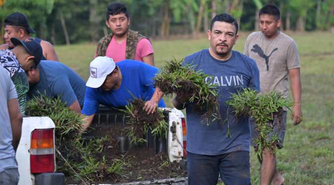 Al amanecer, con los primeros rayos que van desvaneciendo la oscuridad de la madrugada, un grupo de entusiastas jóvenes, habitantes y colaboradores acompañaron al diputado Juan Javier Gómez Cazarín a descargar un camión de 12 toneladas con pasto natural, para prácticamente cubrir la totalidad de la superficie del nuevo campo, en tanto que otro grupo de trabajadores avanzaba con el techado de las gradas.