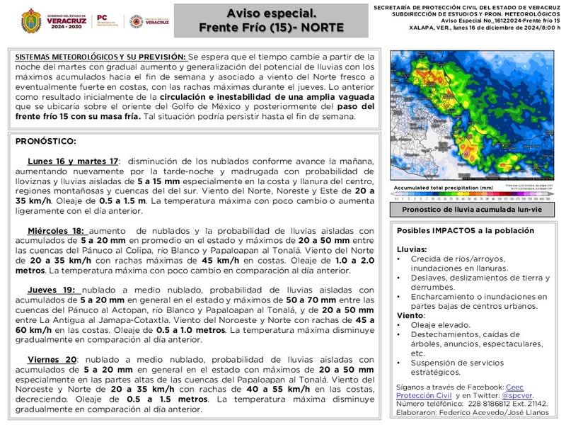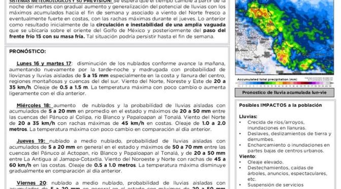 PRONÓSTICO: Lunes 16 y martes 17: disminución de los nublados conforme avance la mañana, aumentando nuevamente por la tarde-noche y madrugada con probabilidad de lloviznas y lluvias aisladas de 5 a 15 mm especialmente en la costa y llanura del centro, regiones montañosas y cuencas del del sur. Viento del Norte, Noreste y Este de 20 a 35 km/h. Oleaje de 0.5 a 1.5 m. La temperatura máxima con poco cambio o aumenta ligeramente con el día anterior. Miércoles 18: aumento de nublados y la probabilidad de lluvias aisladas con acumulados de 5 a 20 mm en promedio en el estado y máximos de 20 a 50 mm entre las cuencas del Pánuco al Colipa, río Blanco y Papaloapan al Tonalá. Viento del Norte de 20 a 35 km/h con rachas máximas de 45 km/h en costas. Oleaje de 1.0 a 2.0 metros. La temperatura máxima con poco cambio en comparación al día anterior. Jueves 19: nublado a medio nublado, probabilidad de lluvias aisladas con acumulados de 5 a 20 mm en general en el estado y máximos de 50 a 70 mm entre las cuencas del Pánuco al Actopan, río Blanco y Papaloapan al Tonalá, y de 20 a 50 mm entre La Antigua al Jamapa-Cotaxtla. Viento del Noroeste y Norte con rachas de 45 a 60 km/h en las costas. Oleaje de 0.5 a 1.0 metros. La temperatura máxima disminuye gradualmente en comparación al día anterior. Viernes 20: nublado a medio nublado, probabilidad de lluvias aisladas con acumulados de 5 a 20 mm en general en el estado con máximos de 20 a 50 mm especialmente en las partes altas de las cuencas del Papaloapan al Tonalá. Viento del Noroeste y Norte de 20 a 35 km/h con rachas de 40 a 55 km/h en las costas, decreciendo. Oleaje de 0.5 a 1.5 metros. La temperatura máxima disminuye gradualmente en comparación al día anterior.