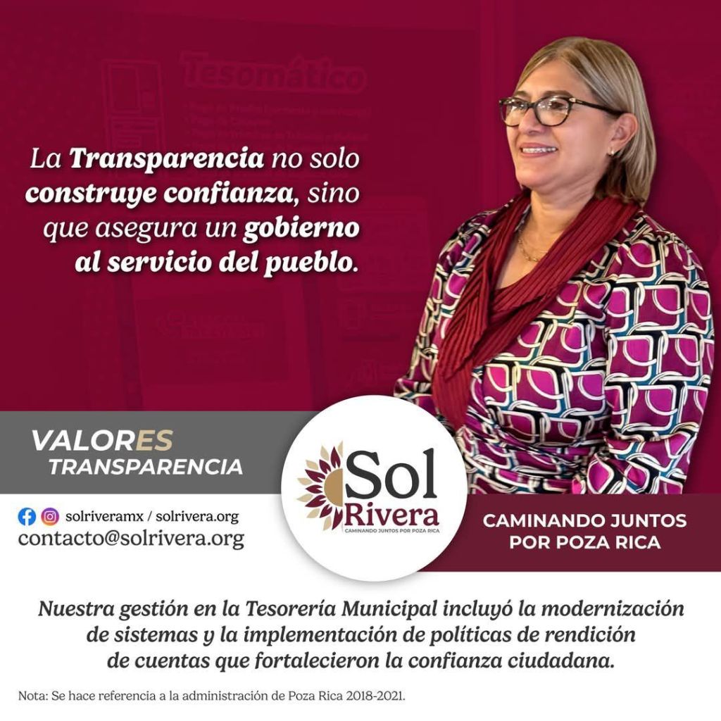 Soledad Rivera Correa o La conta Sol, como cariñosamente la llaman miles de alumnos quienes han recibido de ella guía y ejemplo, tomo la decisión de inscribirse en el proceso interno de morena para contender por la alcaldía de Poza Rica, Sol Rivera, es la aspirante a presidenta municipal más ciudadana de todos los prospectos que buscan administrar los recursos de una de las ciudades más importantes del norte del estado, Contadora Publica y Auditora, posee una trayectoria personal, académica y profesional con excelentes resultados comprobables, ya que en su paso como titular de la tesorería municipal en el periodo 2018-2021 logro sistematizar gracias a la tecnología los ingresos y egresos administrados, entregando finanzas sanas reales que hoy respaldan su integridad y capacidad.