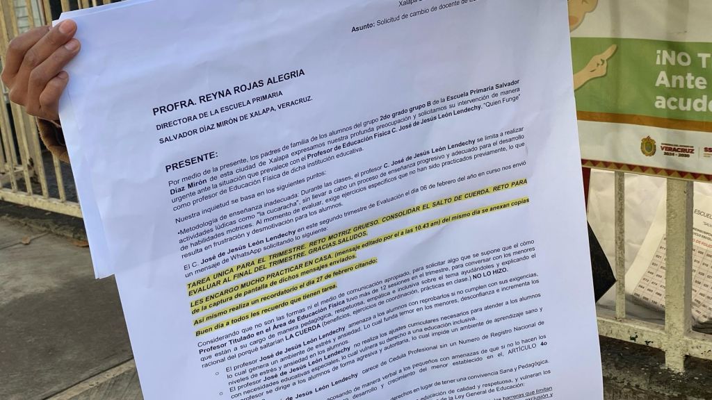 «El Profesor que funge como maestro de educación física es violentador con los niños de manera verbal el decir nos saltas la cuerda te voy a reprobar no te amarras las agujetas te voy a reprobar y el pequeño sufre estrés el pequeño ya no quiere venir a tomar clases. Son formas en las cuales son nos comunica a través de un WhatsApp no hay un escrito no nos pidió ni un material al inicio del segundo trimestre solamente la evaluación será que salten la cuerda si no la saltan los repruebo», dijo María Morales, madre de familia.