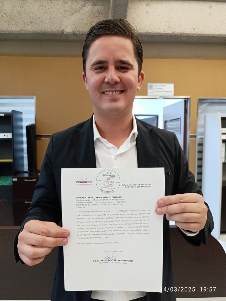 Xalapa, Ver., 14 de marzo de 2025.- Este viernes, el Congreso de Veracruz aprobó en Sesión Extraordinaria la solicitud de licencia del legislador local por el Distrito XXV, Rafa Fararoni Magaña.