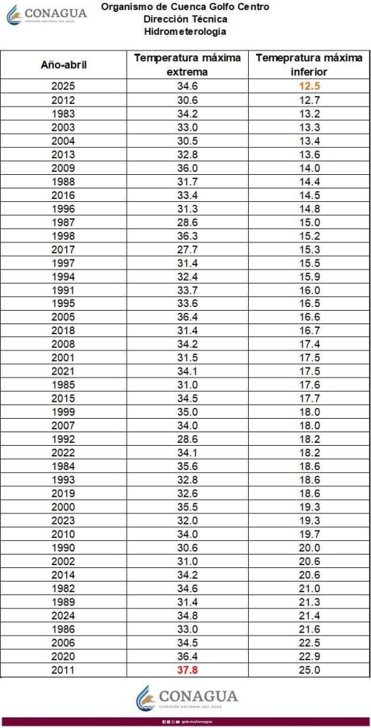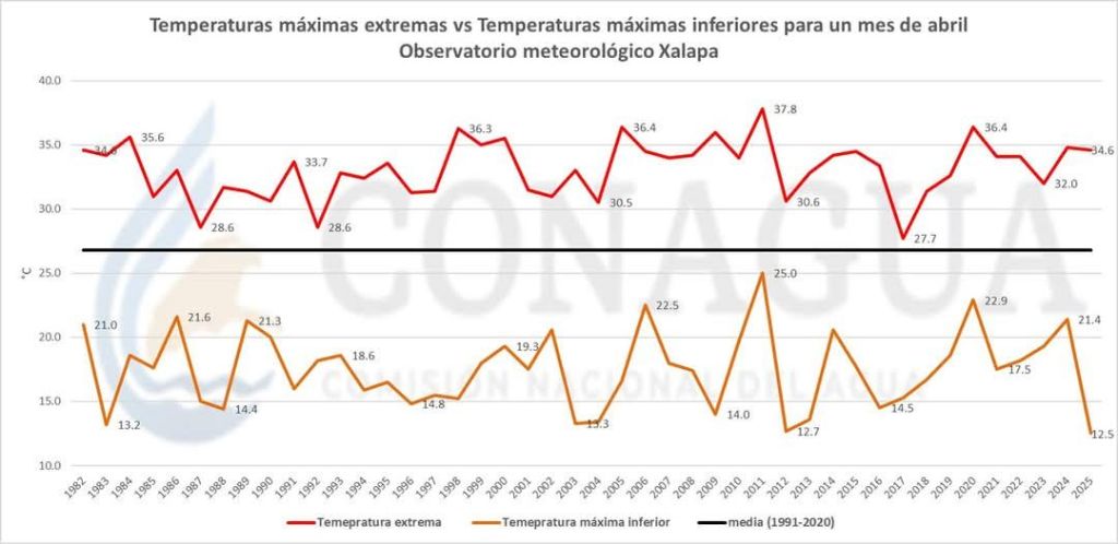 «La gráfica muestra claramente que, aunque abril puede registrar valores extremos por arriba de los 35°C, también ha tenido días con máximas muy bajas, lo que confirma su carácter contrastante por la presencia de los últimos frentes fríos de la temporada», concluyó.