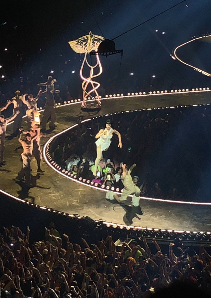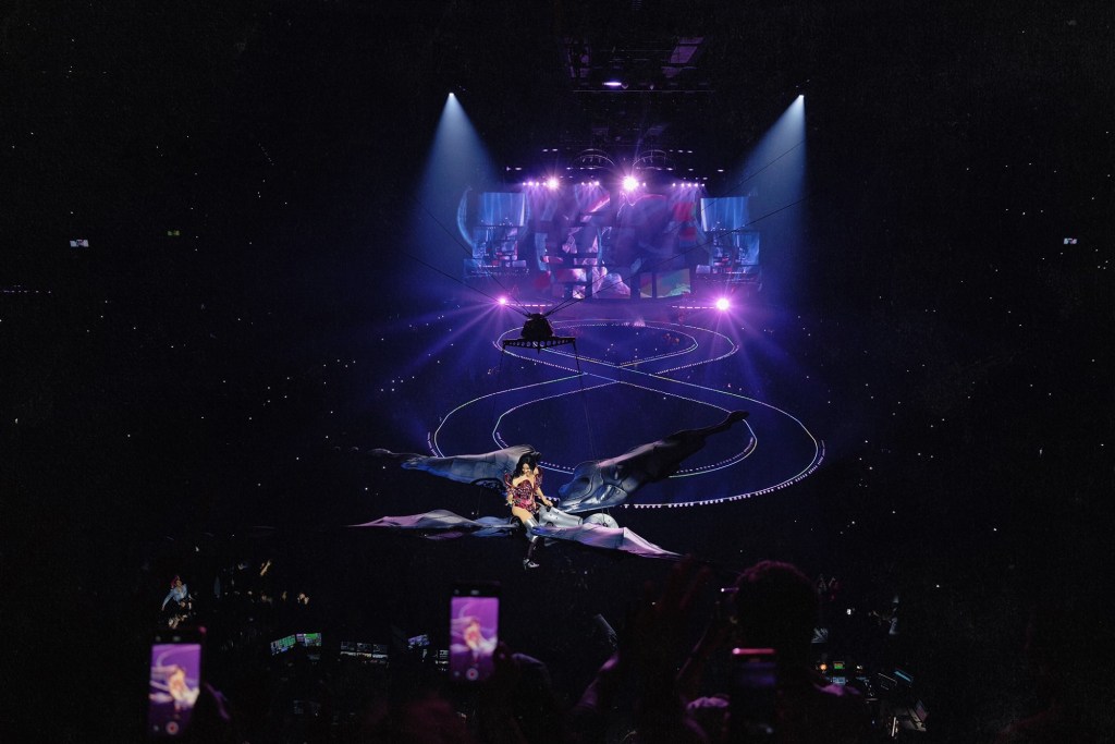 La californiana realizó múltiples cambios de atuendo para cada uno de sus cinco actos y fue durante la interpretación de “NIRVANA” que utilizando un arnés, voló por todo el recinto para que los fans que estaban en los asientos de hasta arriba pudieran verla. A mitad del espectáculo se desbloqueó “un nivel extra” titulado “Choose Your Own Adventure” (Elige tu propia aventura), en la que una ruleta seleccionaba al azar uno de sus álbumes y los fanáticos tenían que escanear un código QR y votar por las canciones que querían escuchar.