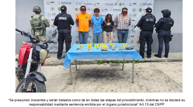 En dicho operativo se detuvo en flagrancia a Luis Fernando “N”, Sahuit “N”, Isabel “N” y Kevin Akin “N”. Asimismo, se aseguró hierba verde seca con características similares a las de la marihuana, piedra cristalina, básculas grameras, pipas, cartuchos y un casquillo balístico, un objeto con características similares a las de un arma de fuego y una motocicleta sin placas de circulación.