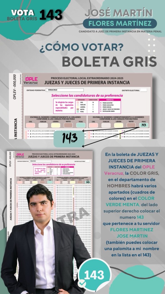 Este 1° de junio, marca el número 143 en la boleta gris de juezas y jueces de primera instancia en materia penal, recuadro verde menta 143 , por José Martín Flores Martínez.