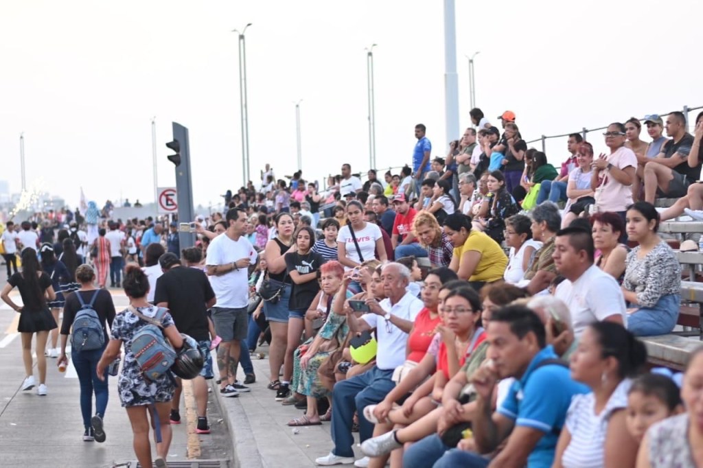 Los asistentes abarrotaron las gradas instaladas a lo largo del recorrido para disfrutar de las bastoneras, comparsas, batucadas, escuelas de samba, academias de danza, así como la participación de estudiantes de secundaria y bachillerato y de dos coloridos carros alegóricos.