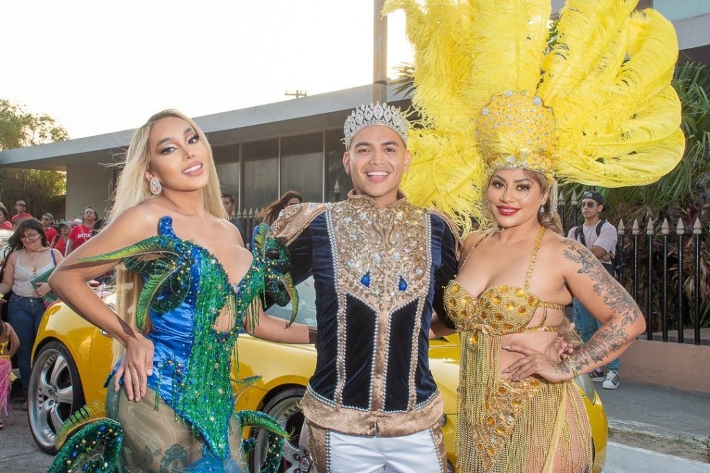 Al ritmo de la batucada y acompañado de zanqueros y su Comité de Trabajo, César de Alegría desfiló a bordo de un auto convertible (Miguel Zalezgon) acompañado de la reina trans electa, Kelly Caracas así como de la electa reina de los Estilistas, Doris Beltrán.