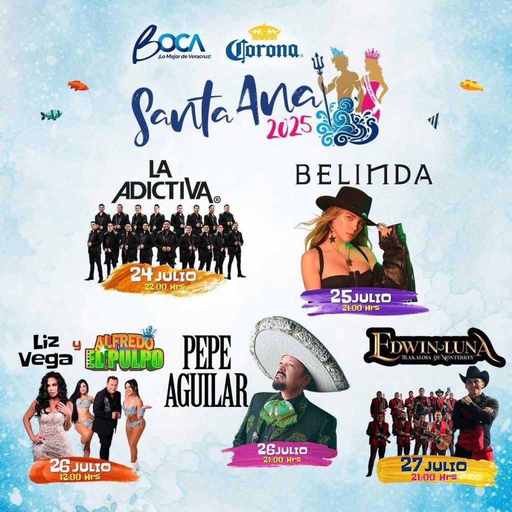 El alcalde Juan Manuel Unánue Abascal anunció que La Adictiva, Pepe Aguilar, El Pulpo y sus teclados, así como Edwin Luna y La Trakalosa de Monterrey también serán parte de estas fiestas patronales que se llevarán a cabo del 20 al 27 de julio en diferentes puntos de la cabecera municipal de Boca del Río.