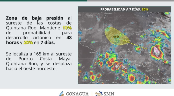 Asimismo, se mantiene la vigilancia de otro sistema de baja presión que se ubica en la parte sureste de Quintana Roo y el cual pudiera moverse hacia el oeste y noroeste, es decir, rumbo hacia el Golfo de México.