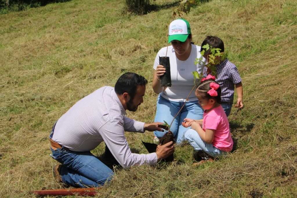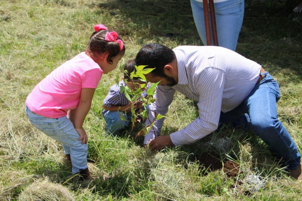 En compañía de su familia y para concientizar en los más pequeños planto varios arbolitos en este rancho, donde además convivio con las y los asistentes.