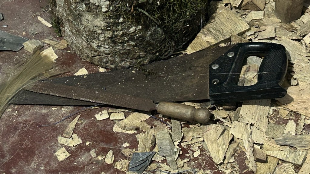 Desde entonces, la madera de quimite —ligera, fibrosa y resistente— se convierte en su cómplice. Con apenas un machete, un serrucho, una gurbia y una chaveta, Adán transforma los troncos en expresiones: calaveras con barba, bigotones rizados, ancianos sonrientes.